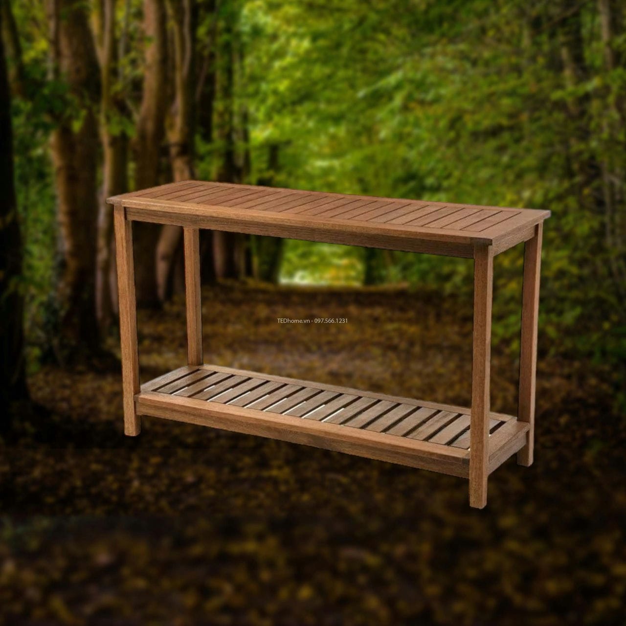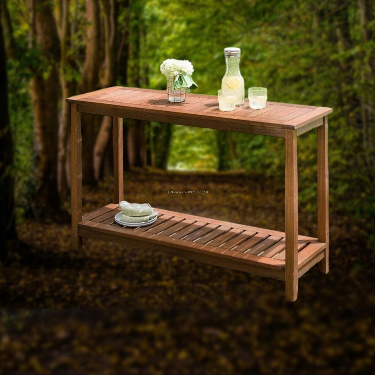 Hoàn thiện sân hiên của bạn với một chiếc bàn console này. Được làm từ gỗ teak tạo cảm giác mộc mạc, gần gũi, đơn giản, món đồ này có bàn hình chữ nhật có kệ thấp được cân bằng trên các chân gỗ.