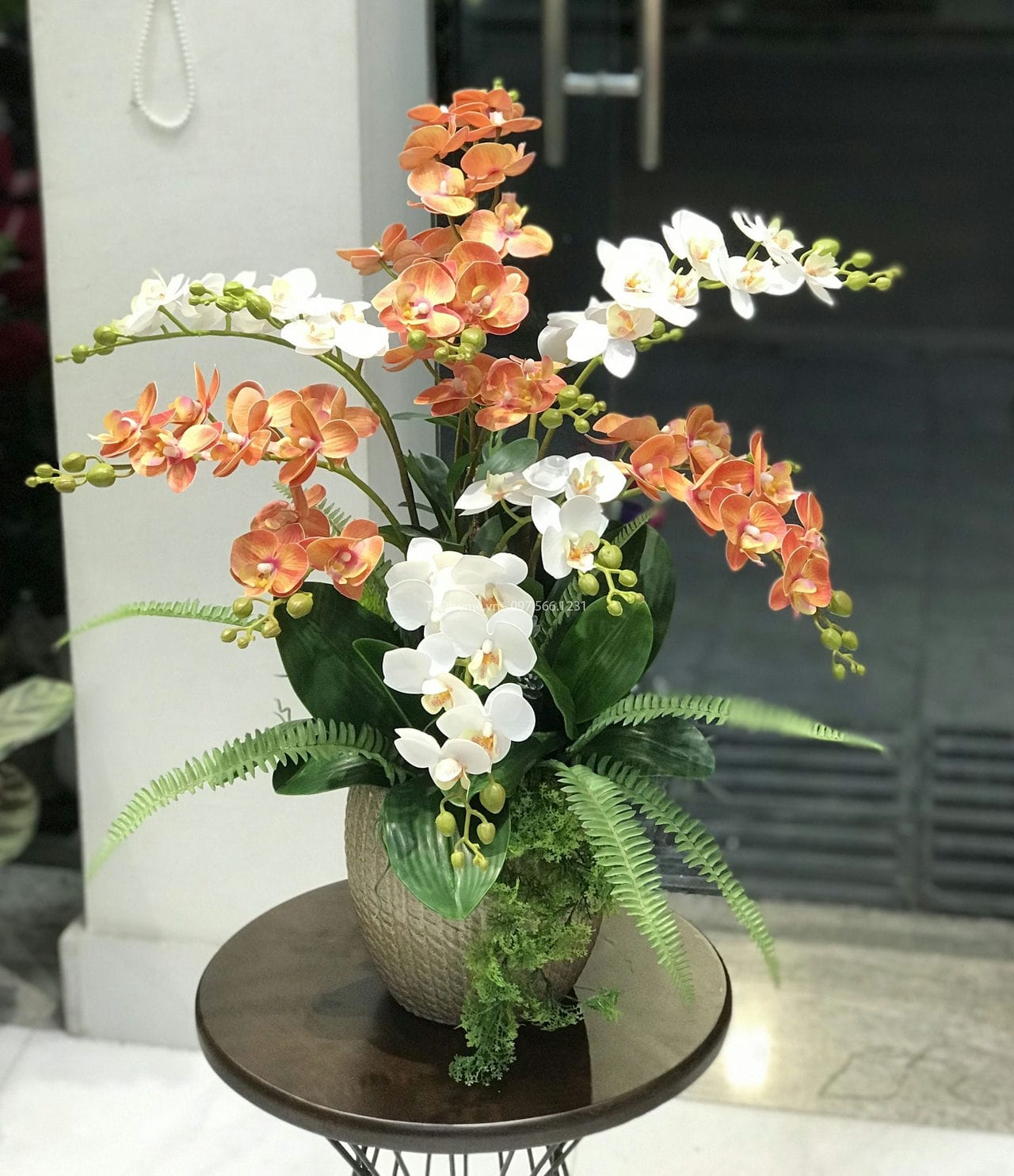– Chậu gốm, hoa lan tiểu hồ điệp cao su, lá lan và lá dương xỉ cao su.