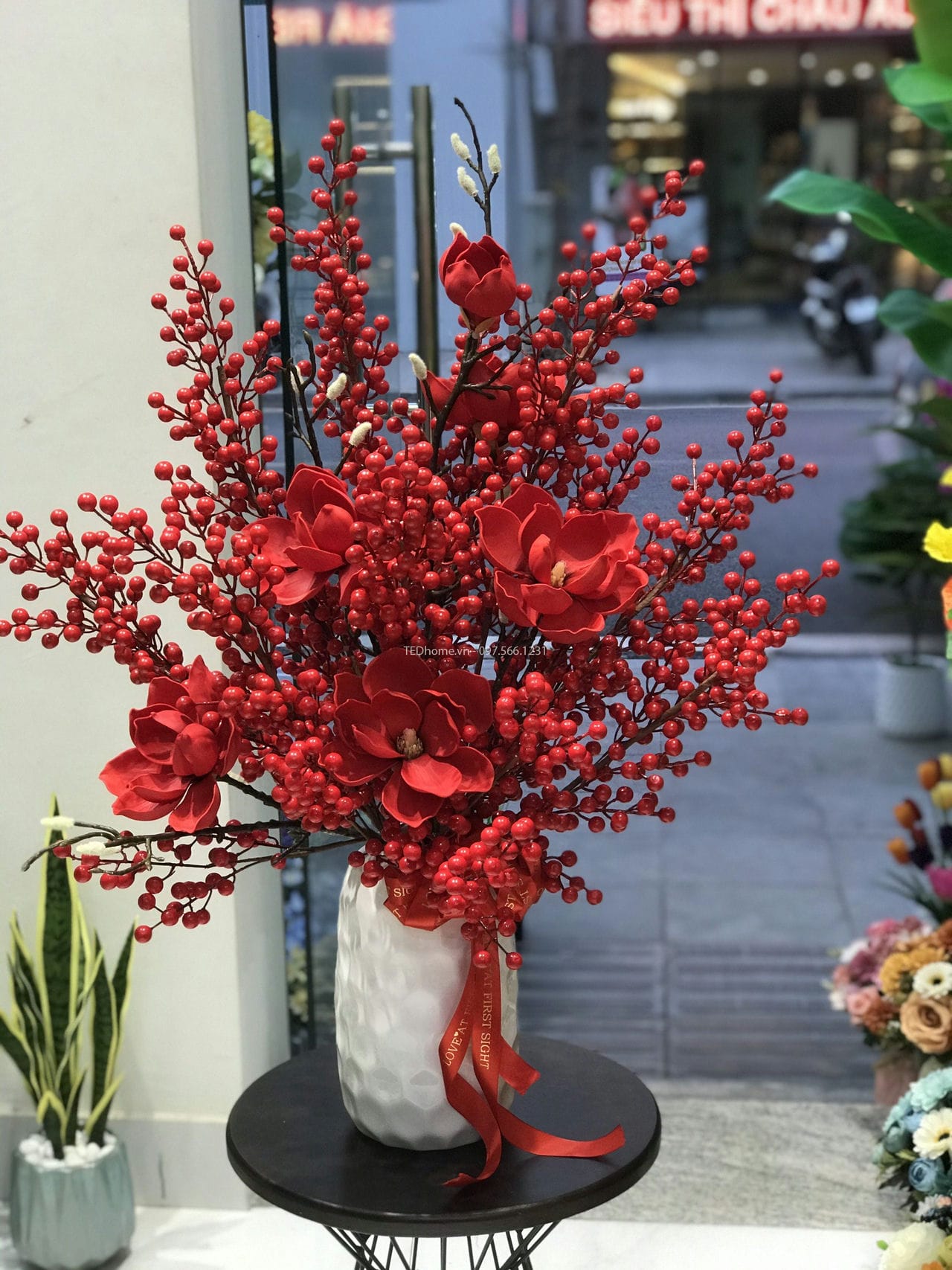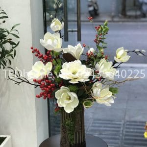 – Lọ gốm, hoa mộc lan xốp cao su cắm kèm cành đông đào