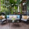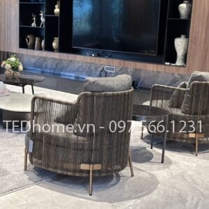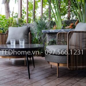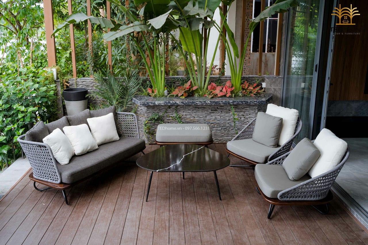 Ghế sofa TEGS034, gỗ teak, khung inox, đan sợi dây dù cao cấp, đệm và tựa bọc vải chống nắng, trượt nước cao cấp.